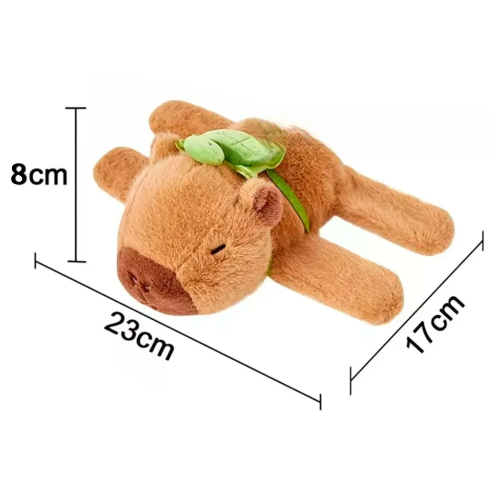 Agora, imagine que no pulso dele há uma capivara de pelúcia fofa, com uma pequena tartaruguinha nas costas — como um abraço silencioso dizendo: "Está tudo bem. Eu estou com você."